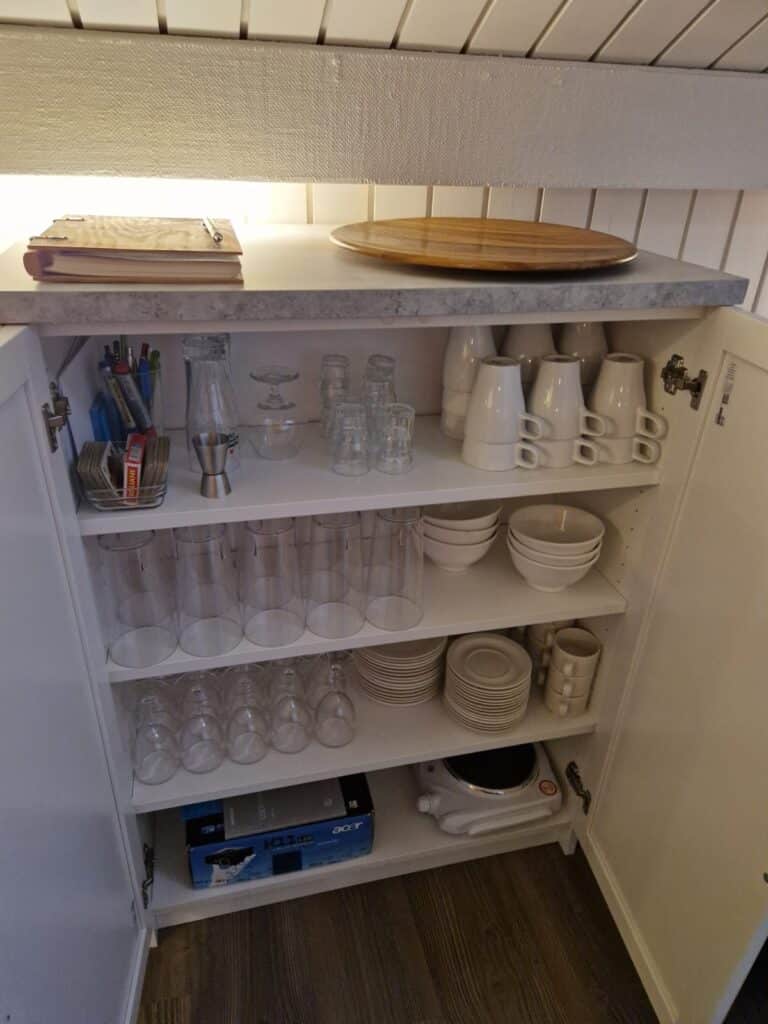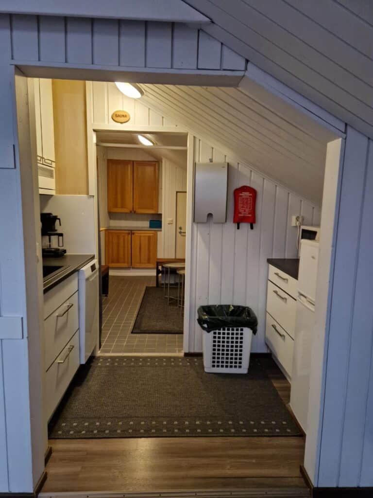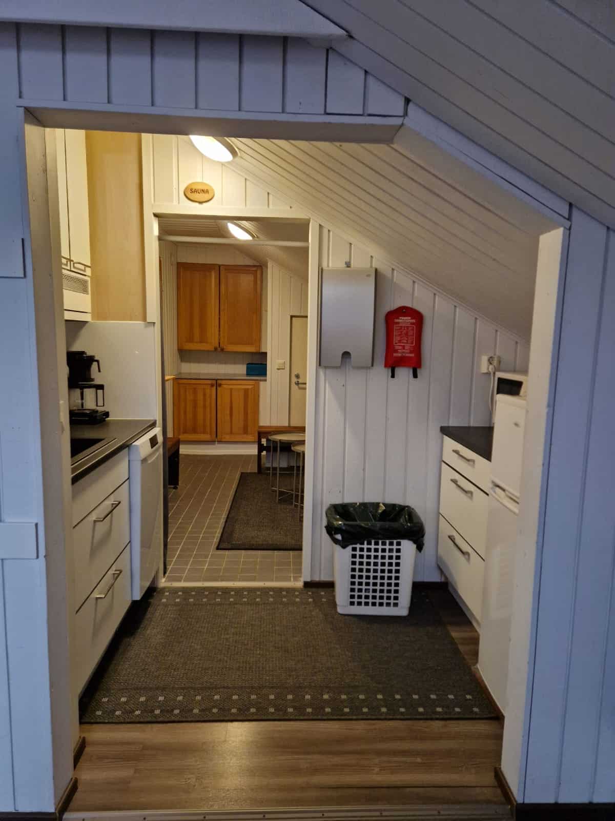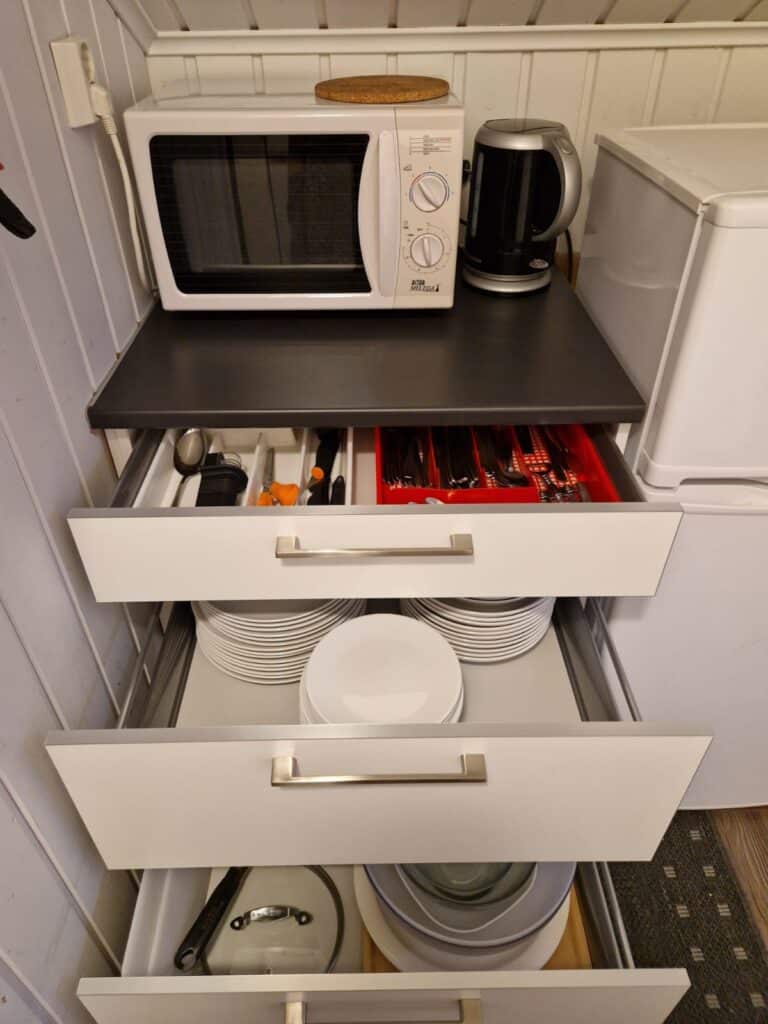 - Keittiössä on jääkaappi, jonka yhteydessä pieni pakastin, siirrettävä liesitaso, astianpesukone, kahvinkeitin, vedenkeitin, mikroaaltouuni ja astiat 15 hengelle. Keittiössä ei ole uunia